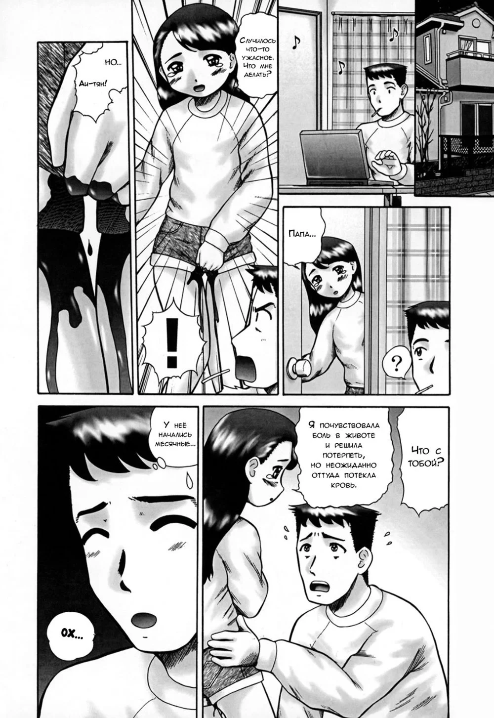 nekonomori maririnПапаша попал в сложную ситуацию: у дочки случилась первая менструация как раз тогда, когда жена была в отъезде. Пришлось ему самому помогать дочке...Из танкобона "Kazoku no Shisen Shisshiki" (A Secret Glance at Family Members), 2002 г.