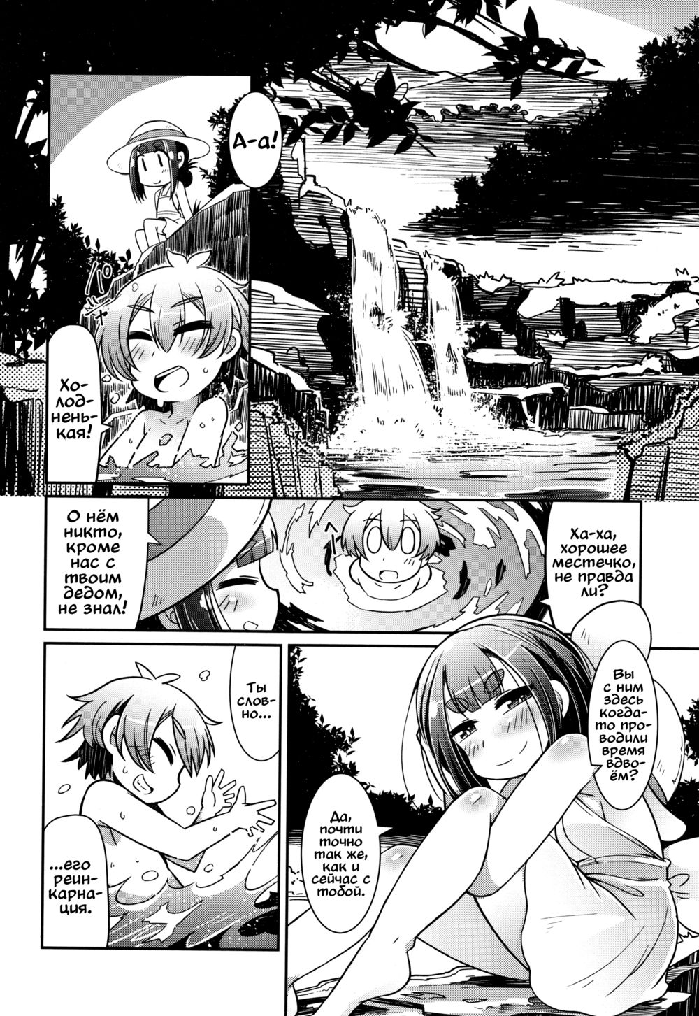 amagaeruПереведено по заказу пользователя zaicevnatsu.Является приквелом этого.Кстати, вот эти неестественные брови - это фишка моды рисованных бровей эпохи хейан (8-12 век). Тогда идеалом женской красоты было жирное круглое лицо и эти нарисованные выше обычного брови, но если история выбросила жирноту на свалку, то брови то и дело ещё появляются.