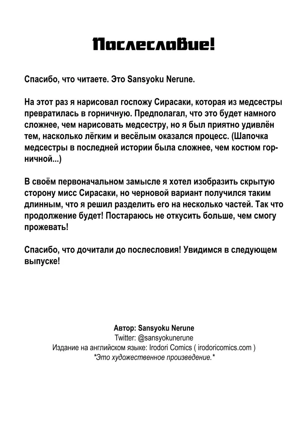 sanshoku neruneКогда Танака выписывается из больницы и снова оказывается дома один, он напивается в стельку и заказывает через интернет горничную, чтобы та составила ему компанию. К его удивлению, медсестра, которая "помогала ему" в больнице, на следующий день появляется у его двери в униформе горничной и очень серьёзно относится к своей работе по предоставлению ему "услуг".Сиквел манги Nurse no Shirasaki-san ni Seiyoku Shori o Shite Morau Hanashi.-----------------------------Ошибся в тегах, в тексте? Пишите - поправлю!Понравилось? Вы знаете, что делать!