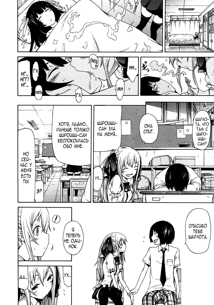 akatsuki myuutoХирото - простой замкнутый школьник, который не навидит распутных девчонок и озобоченных парней, от чего у него нет друзей. В один прекрасный день, в его класс переводится полукровка Шарлота, которая сразу же заявляет, что умеет читать сердца людей (знает самые сокровенные желания) и что Хирото самый озабоченный в школе. Хирото конечно возмутился такому заявлению и не поверил. Тогда Шарлота доказала ему своим жестким менетом, приэтом читая его мысли и делая как он захочит.