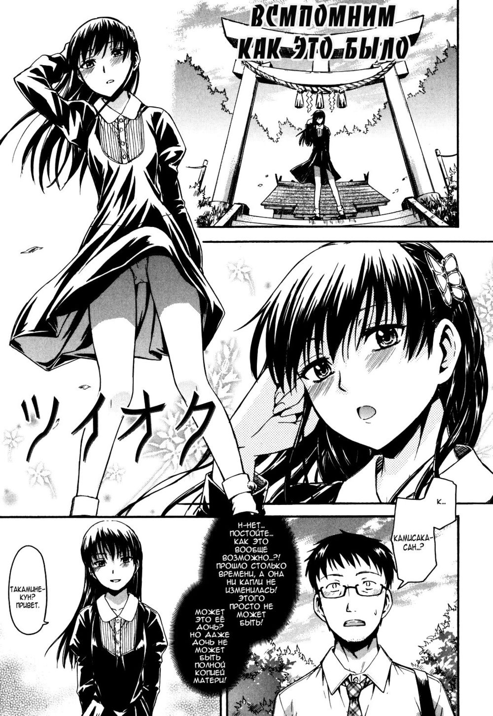 tsuruta bungakuПриехав в родной город, где он не был очень много лет, наш герой по имени Такамине решил пройтись по памятным местам и в частности по храму, где когда-то вместе с девочкой Камисакой лишился девственности. Какого было его удивление, когда на последней ступени храма его встретила... Нисколько не изменившаяся Камисака!Сборник Himitsu no