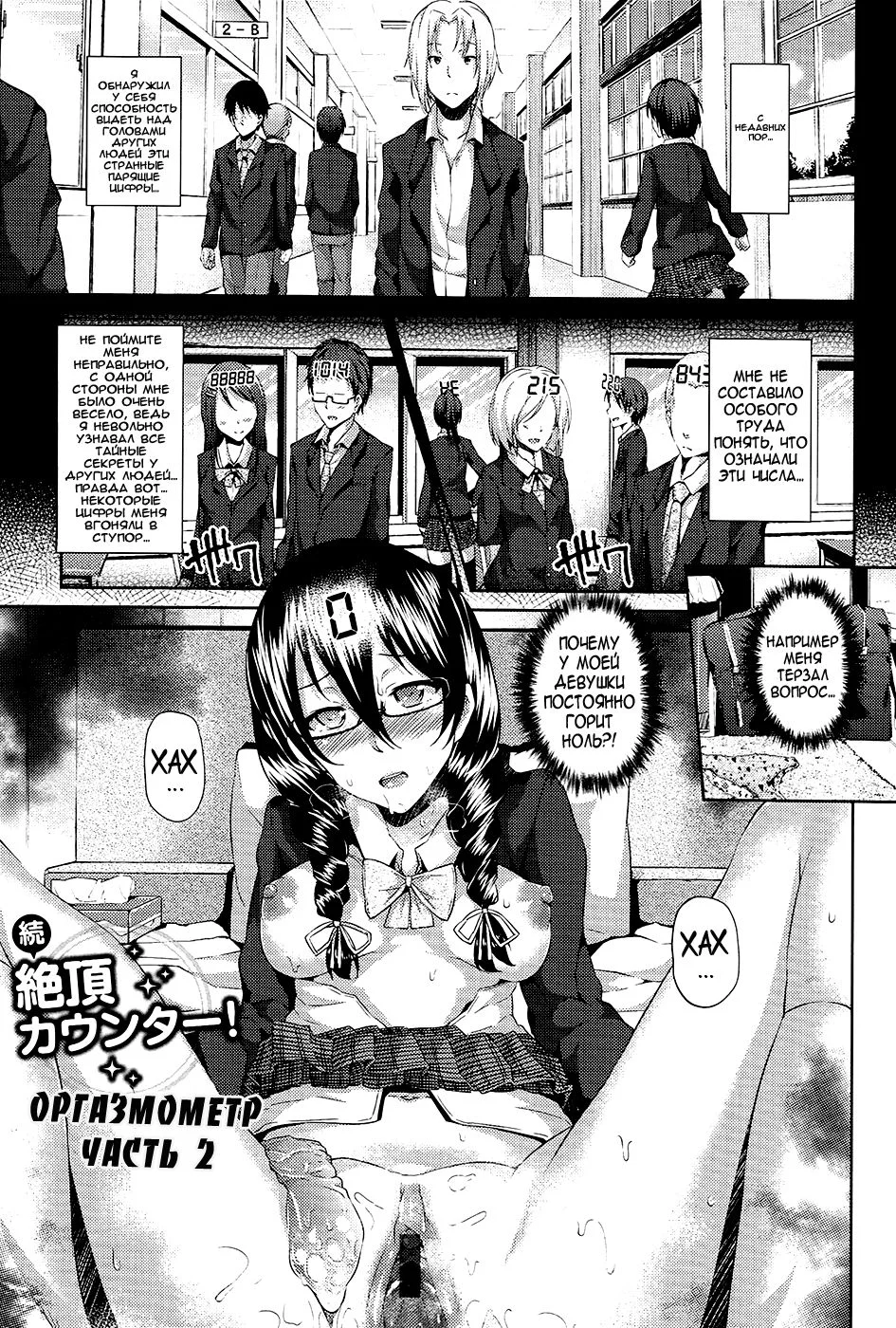 ryomaКак мы помним в конце первой главы способность видеть сколько оргазмов испытали люди, перешла от Казуо к другому герою. И теперь он способен не только видеть зашкаливающий оргазмометр надо головой девушки Казуо, но и ноль над головой своей девушки...