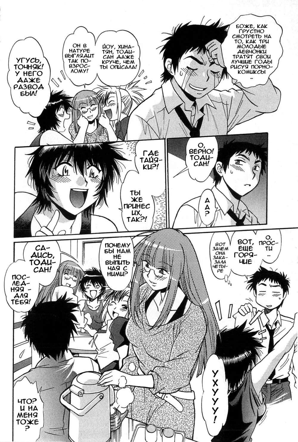 manabe joujiТоди-сан вынужденно стал счастливым (?) соседом неугомонной художницы хентая: Хина-тян. И для полного… напишем так, счастья она привела в дом еще двух помощниц: Аюми Оно и Моти. Энергичных и очень голодных во всех смыслах.